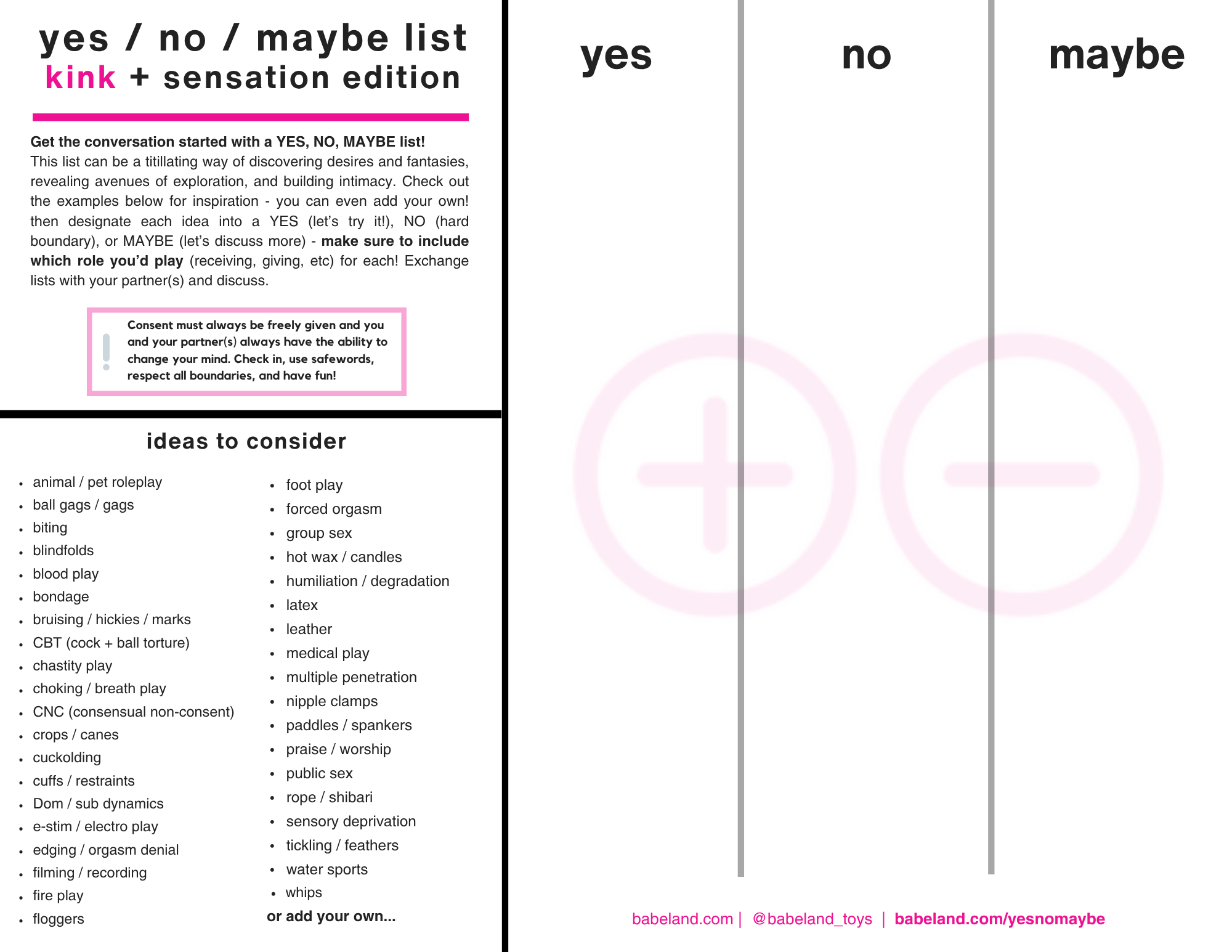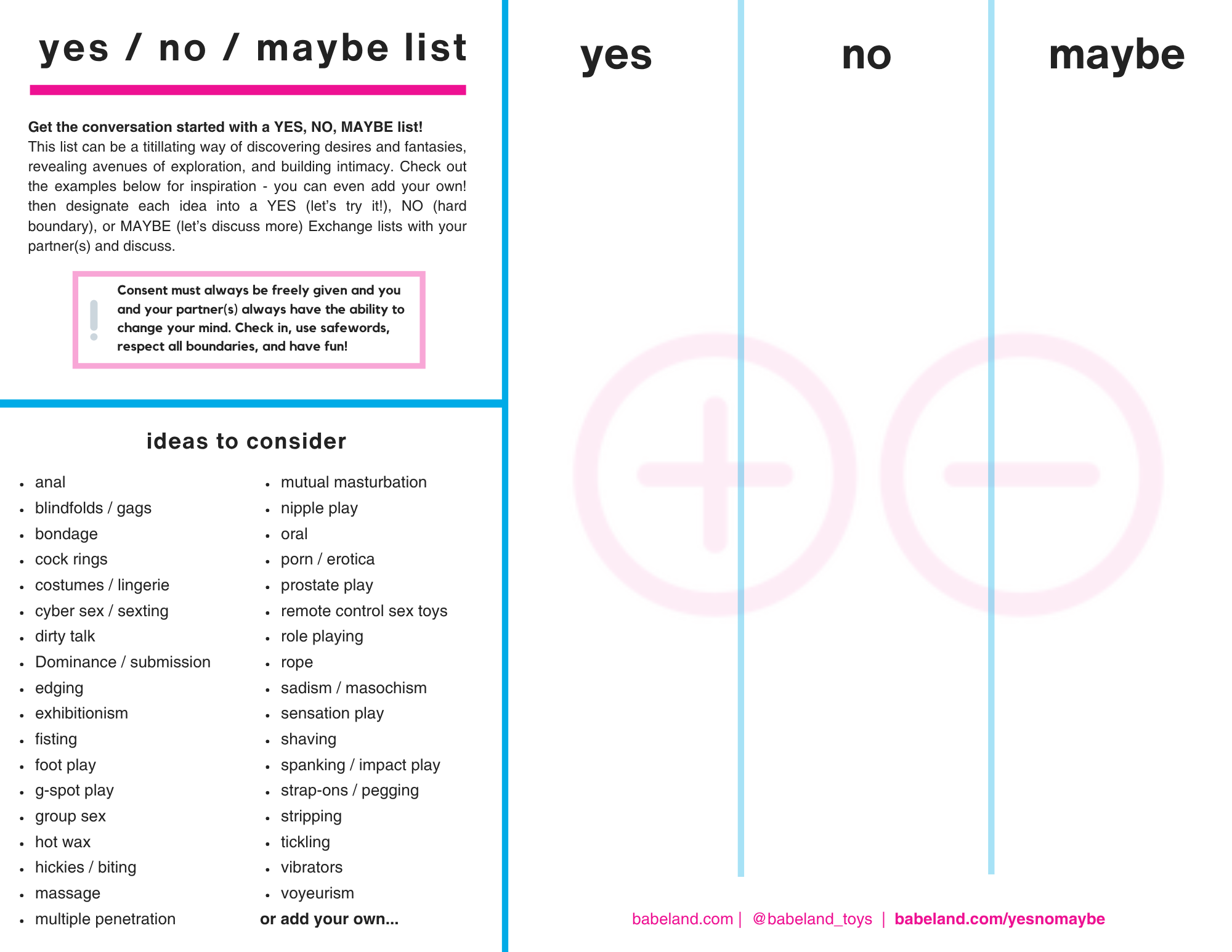 YES / NO / MAYBE lists are not a contract. These lists do not replace communication, and should always be used with ongoing consent practices like check-ins and safewords.